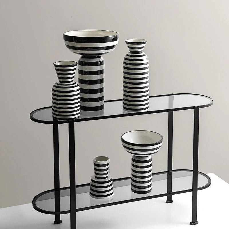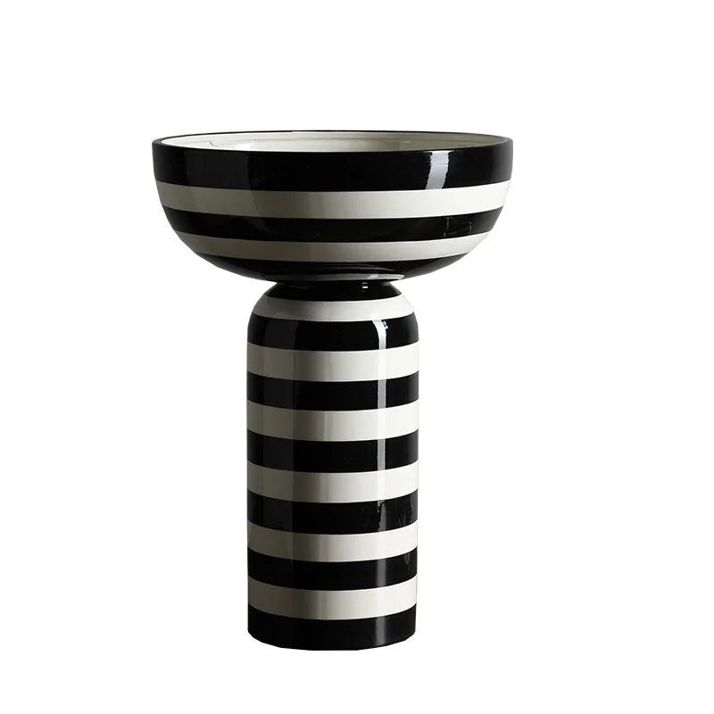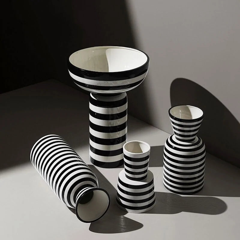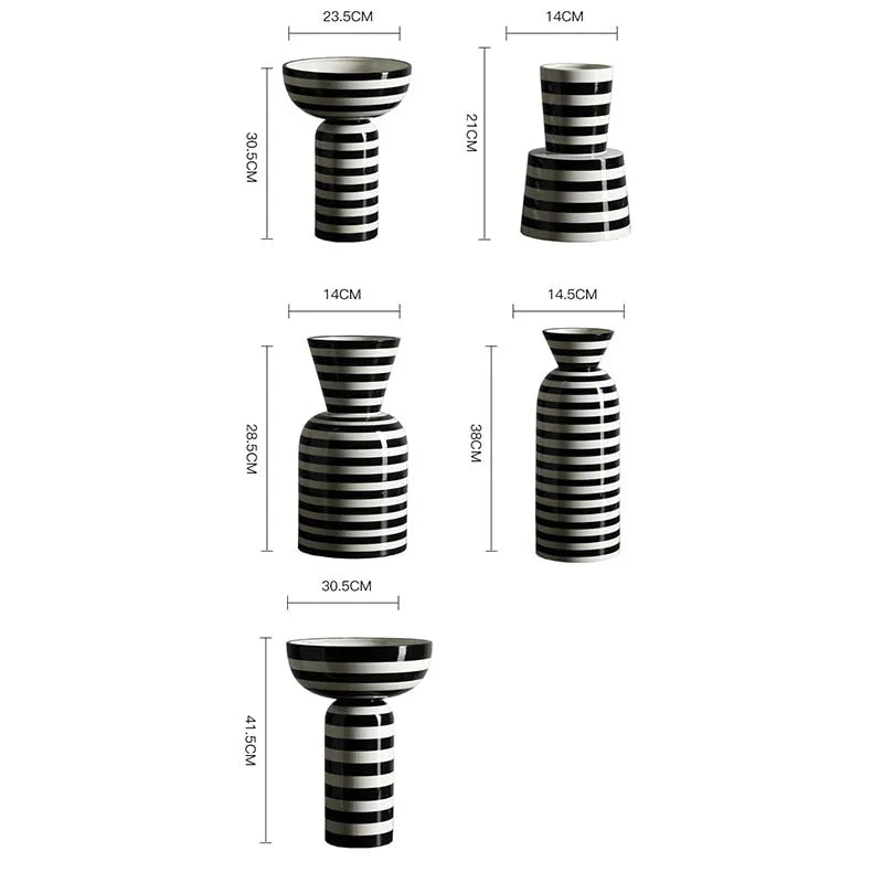 Con su llamativo diseño de rayas blancas y negras, este jarrón añade un toque de elegancia contemporánea a cualquier espacio, ya sea su hogar u oficina. Pintado a mano con meticuloso cuidado, cada trazo cuenta una historia de artesanía y arte.