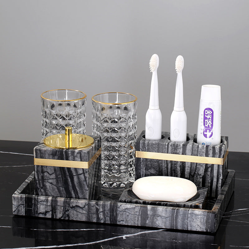 Introducing the Black Gold Bar Set, featuring five pieces crafted with premium materials. This set includes an Earl Black Gold Bar Square Bottle and Black Gold Bar Cup adorned with marble accents. Designed for the public, it adds a touch of luxury to any setting. Packing list includes one Marble wash set.