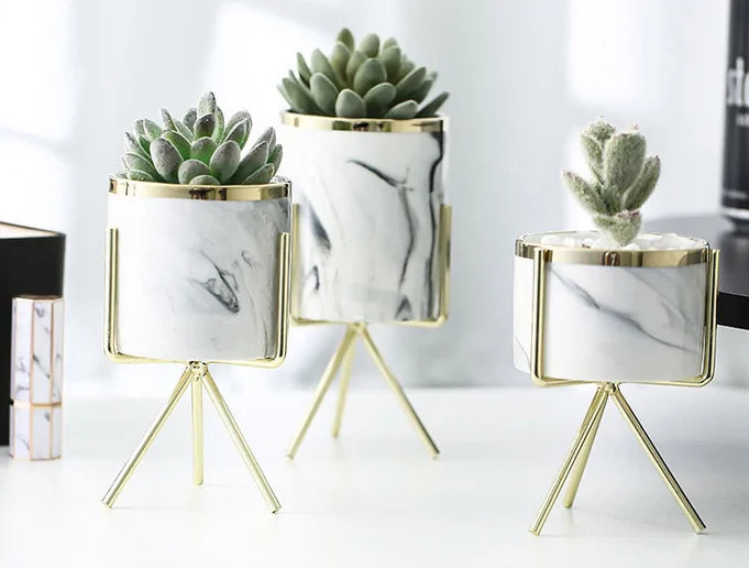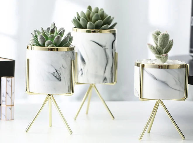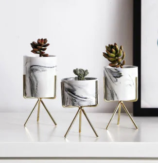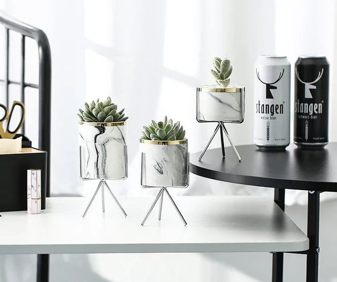 Crafted with meticulous attention to detail, this vase features a sleek black iron rack that perfectly complements the minimalist white ceramic flowerpot. The Nordic marble pattern adds a touch of refinement, making it a versatile addition to any interior setting.