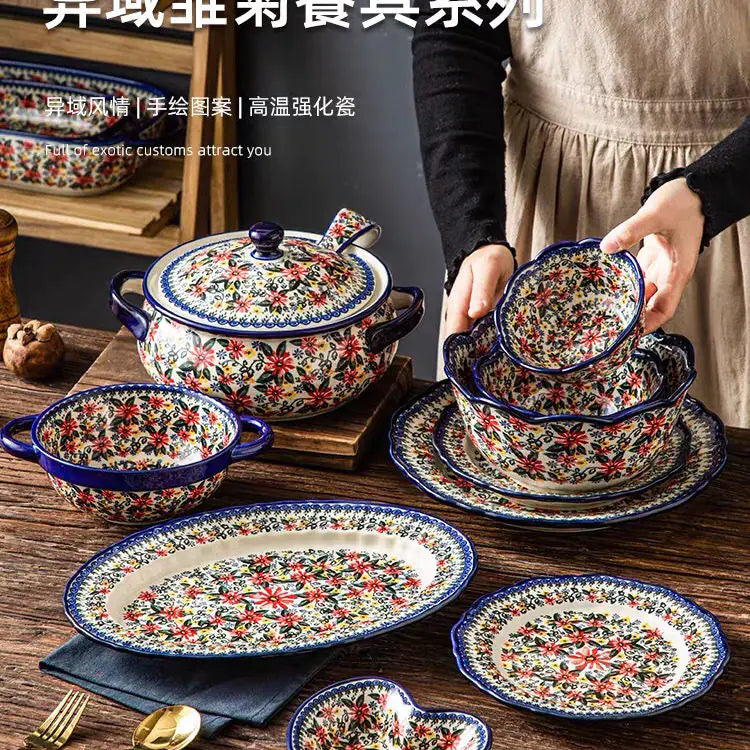 "Discover the perfect blend of nostalgia and functionality with our Polish Bowl and Plate Ceramic Tableware. Infused with creativity and household charm, these pieces evoke a sense of old-fashioned elegance and retro allure. Whether you're savoring a hearty soup or indulging in your favorite noodles, our meticulously crafted bowls and plates promise to elevate your dining experience. Embrace the vintage-inspired design and add a touch of whimsy to your table setting with our Creative Bowl and Plate Set, bringing a dash of personality to every meal."